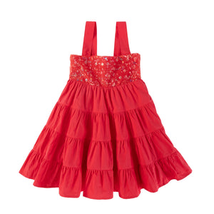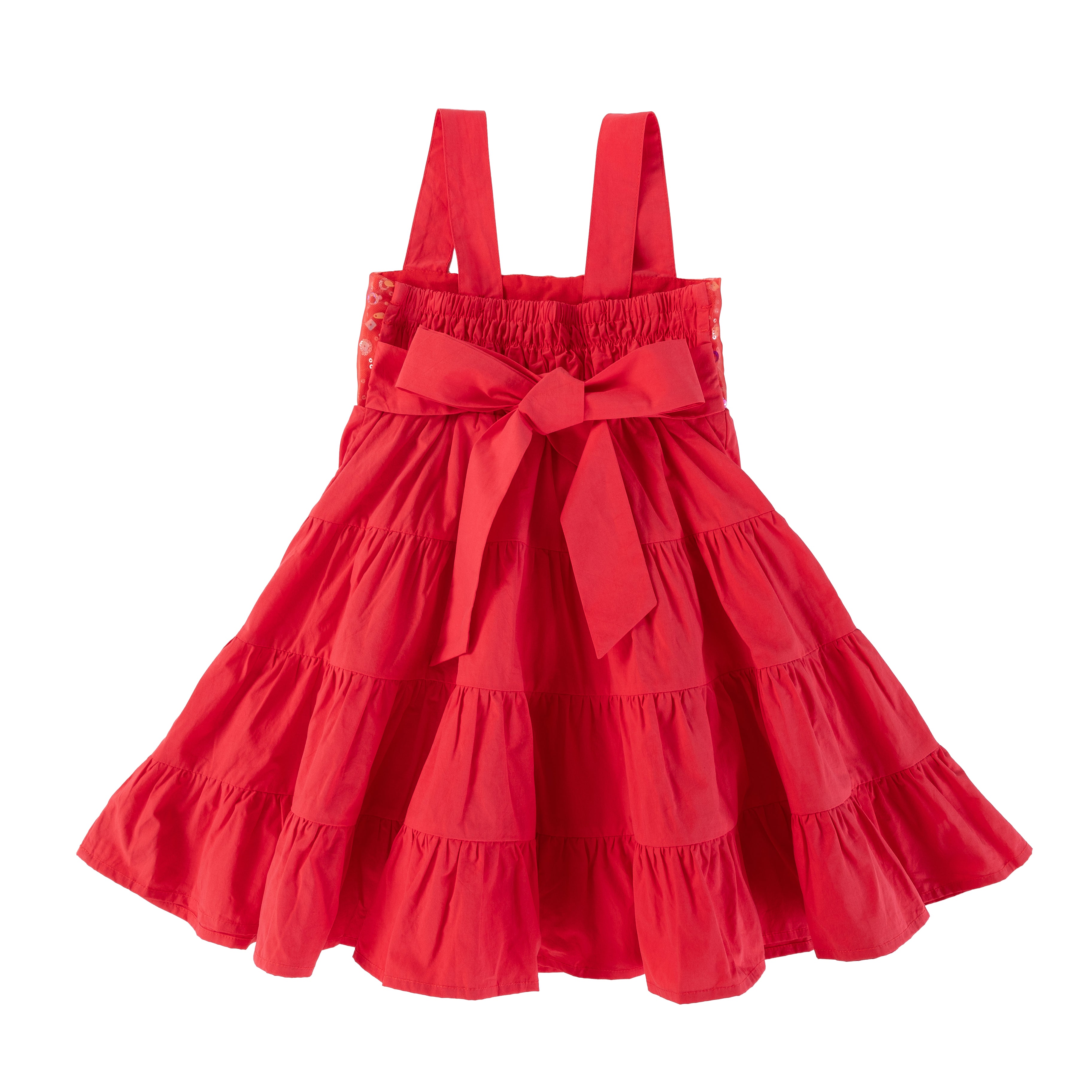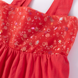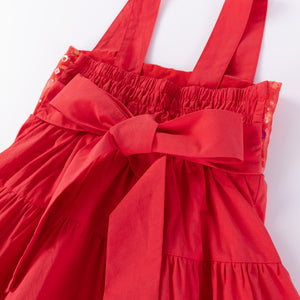 This simple yet beautiful red dress will turn heads at Christmas parties, with top sequins adding just the right amount of bling. The flared design is perfect for swirling and twirling, and a ribbon at the back allows for easy adjustment, making it a dress that girls will love!