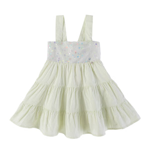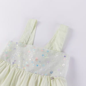 This simple yet beautiful light green dress will turn heads at Christmas parties, with top sequins adding just the right amount of bling. The flared design is perfect for swirling and twirling, and a ribbon at the back allows for easy adjustment, making it a dress that girls will love!