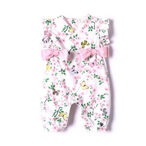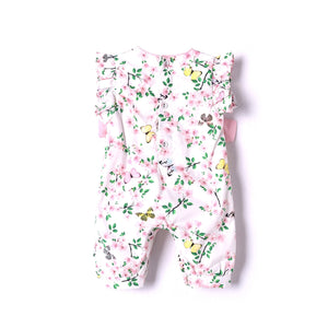 This gorgeous baby girl romper in sweet floral blooms fabric features frill sleeves, pink ribbons on the sides, with back buttons and a concealed press stud crotch opening for ease of dressing your little one.
