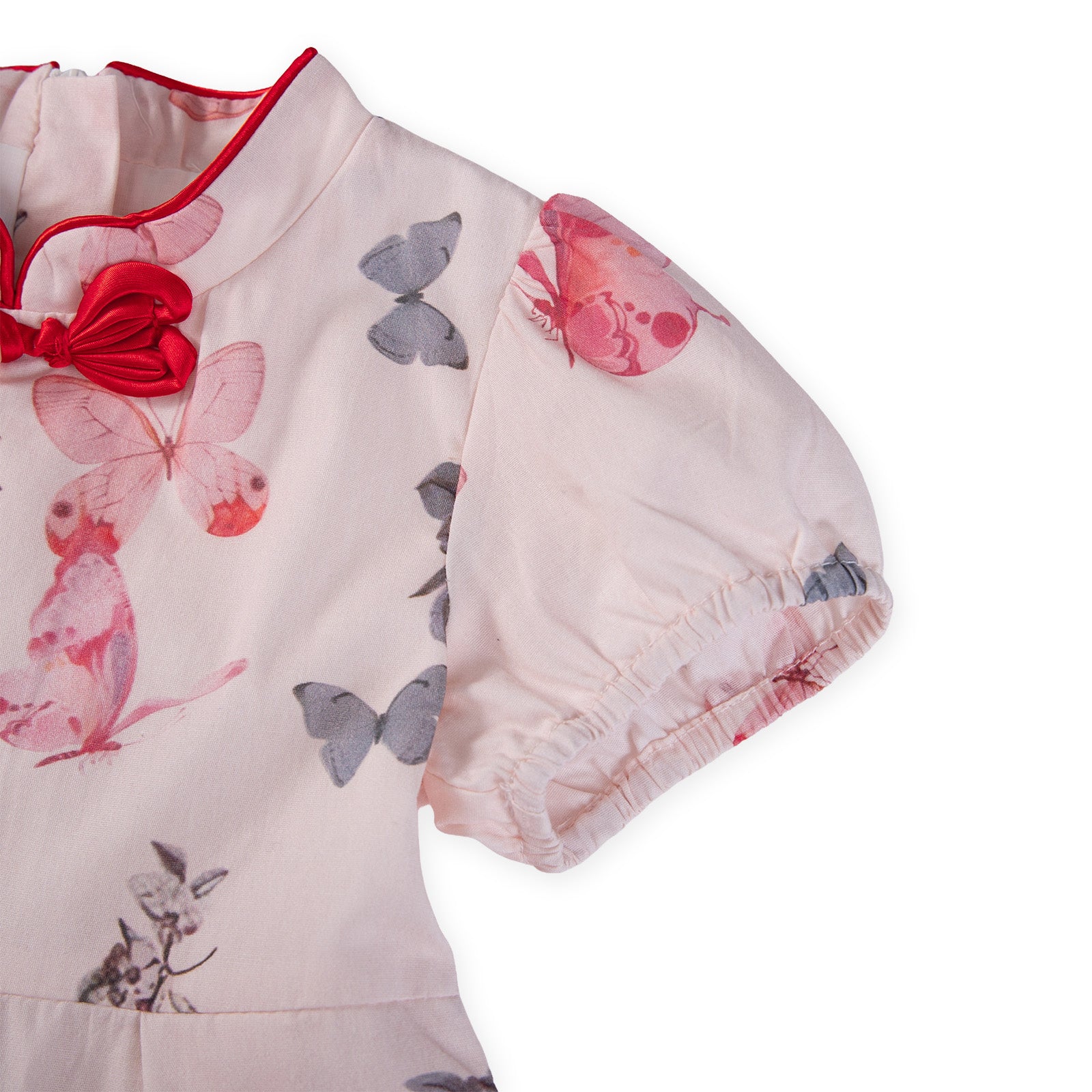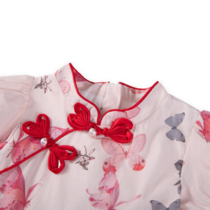 This modern floral cheongsam features a fit-and-flare design that blends comfort with traditional Chinese style. With touches of red and pink floral prints, this cheongsam is perfect for Chinese New Year dinners or family gatherings.