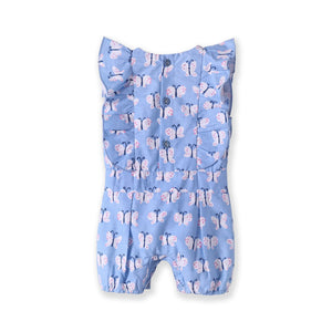 This sweet little outfit features wide frill sleeves, elasticated legs, back button opening and press stud crotch opening for ease of dressing your little one.