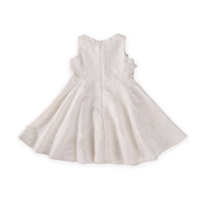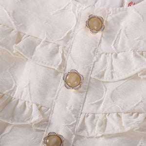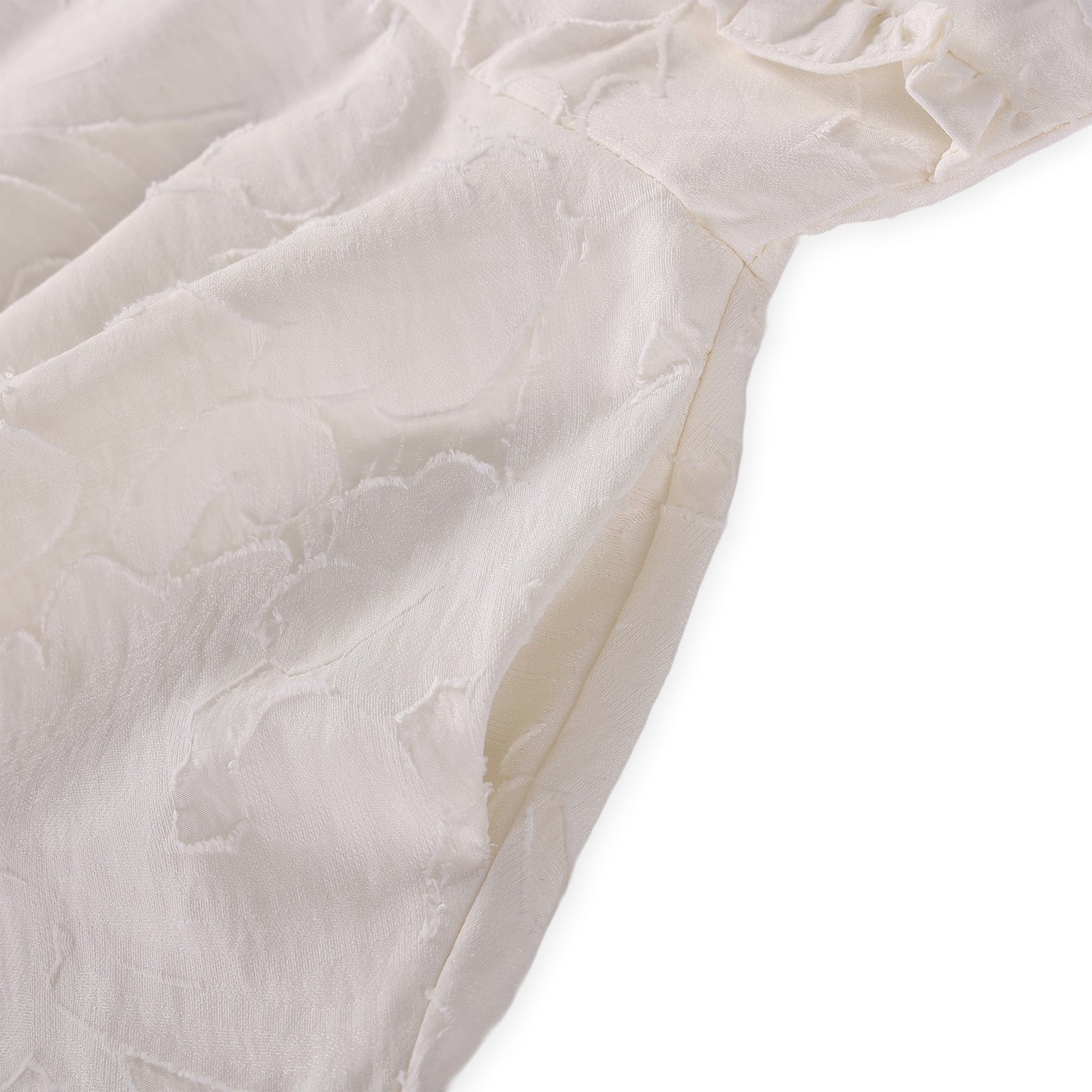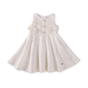 This semi-casual dress features charming ruffles on the bodice and a flared skirt designed for running, playing, and twirling. Perfect for dinners, parties, or any occasion that calls for easy elegance.