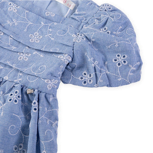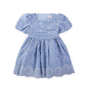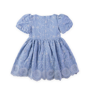 This baby blue dress is truly a timeless charm. The floral embroidery adds an elegant detail, while the square neckline and gently puffed sleeves with elasticated cuffs provide a soft, sophisticated look. The scalloped hem adds a deicate touch, and the lightweight voile lining ensures it's comfortable to wear. The concealed zip at the back combines practicality with style, making this dress ideal for special occasions or a delightful summer day.