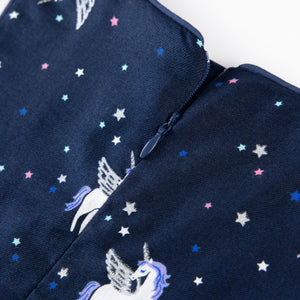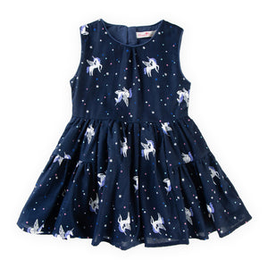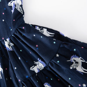 Your little one is sure to love this unicorns and stars dress! The dress features a flare gathers at the sides of the skirt that makes swirling fun. This dress is perfect for a warm day. It has a sweet and fun design that will have your little girl twirling in delight.