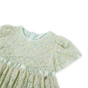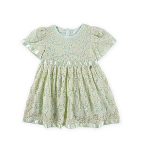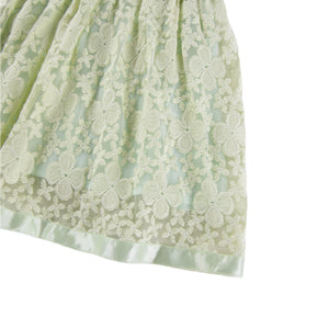 This charming mint lace floral dress is perfect for parties or a chic weekend look, featuring a playful flared design that effortlessly blends comfort and style. A satin ribbon at the waist and hem adds a delicate touch of elegance.