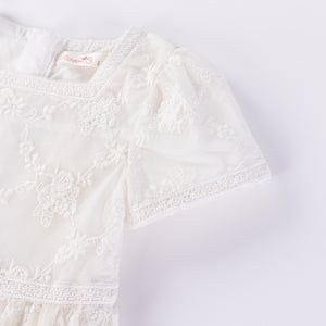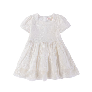 Designed for the ultimate girly fashionista, this dress blooms with delicate floral lace across a shirred bodice, sleeves, and cascading down from the waist into the skirt. The gentle lace at the top flatters the figure, while the lace detailing lends texture and visual creating a dreamy, romantic silhouette. The knee-length skirt sways with every step—light, feminine, and effortlessly elegant—perfect for garden parties, birthday celebrations, or any special occasion.